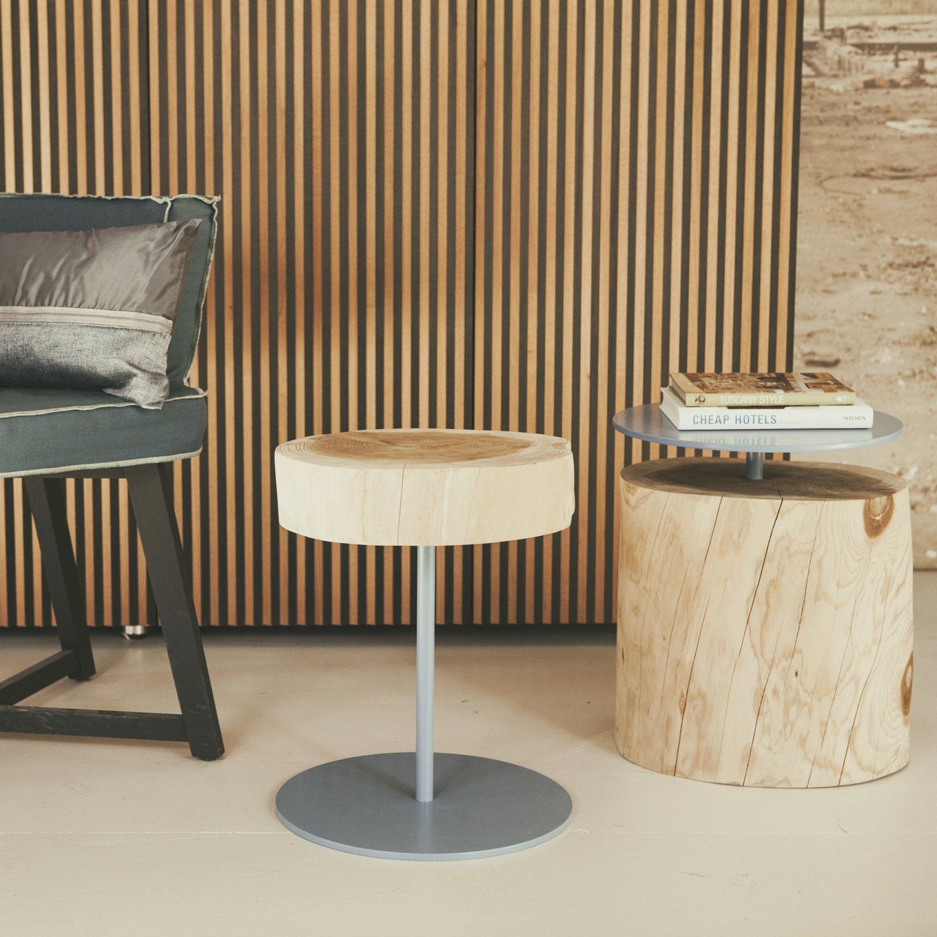 In this series of tables an aspect of natural cedar contrasts with elements of coloured metal that bring out the wood’s natural beauty.